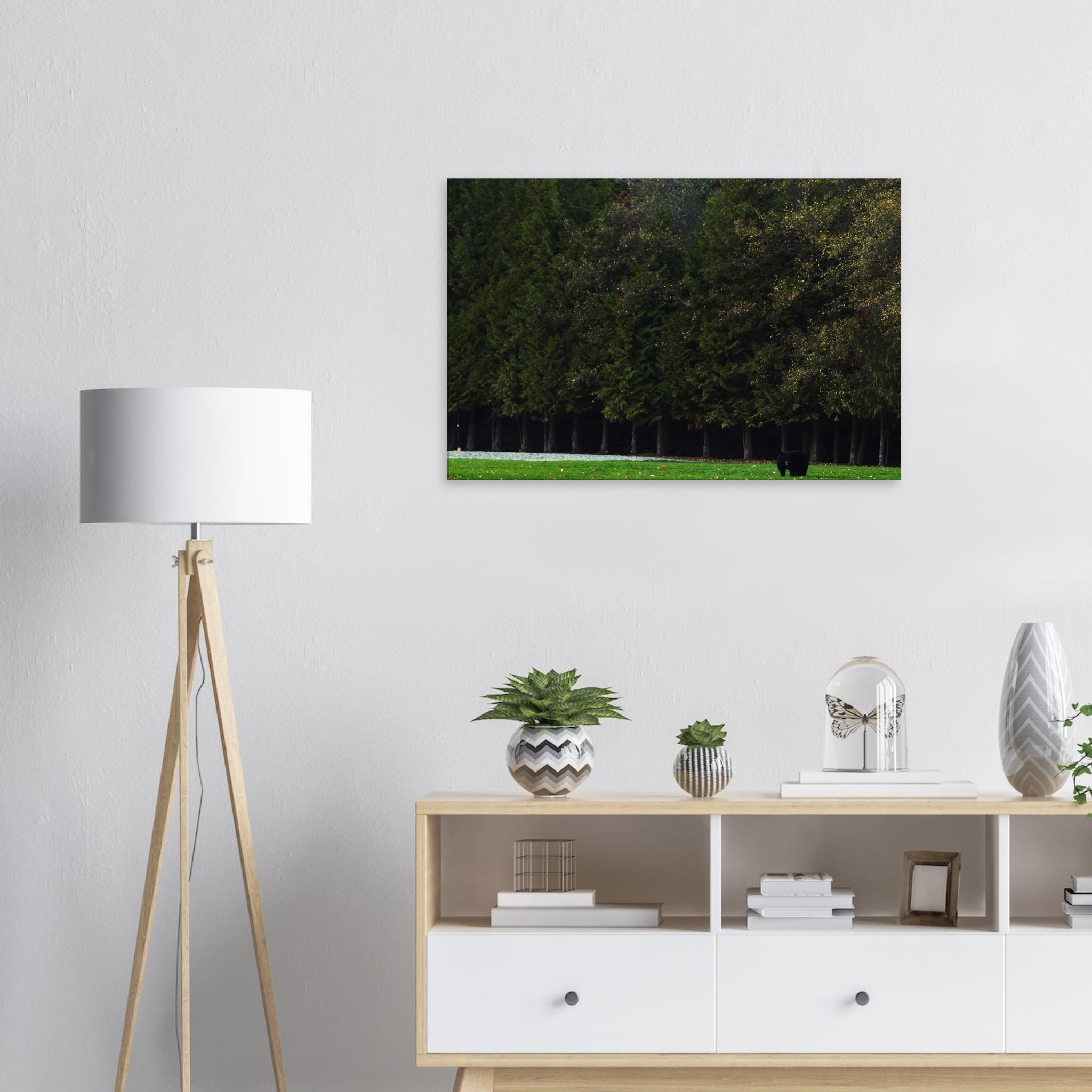 The forest watches here. A lone black bear steps from the treeline, moving slowly across an open field as autumn leaves scatter at its feet. The Park Bear captures that quiet meeting between wilderness and the everyday — a reminder of how nature appears when we least expect it. This piece brings a grounded, contemplative presence to modern, minimalist interiors.