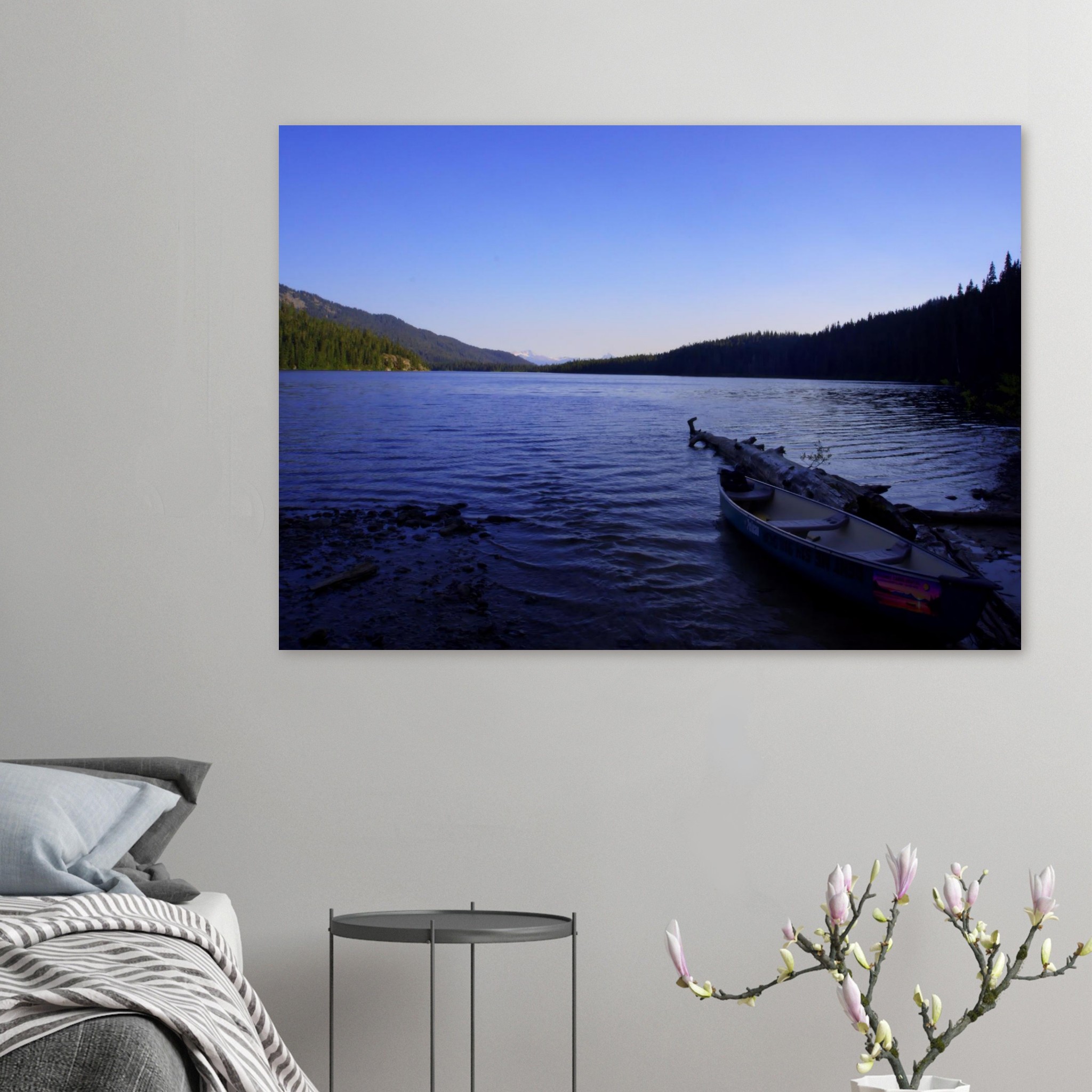 The lake settles here. Evening light softens across still water as a lone canoe rests against the shoreline. Drift captures that quiet pause between day and night — the gentle moment before movement returns. This piece brings a calm, reflective energy to modern, minimalist interiors.