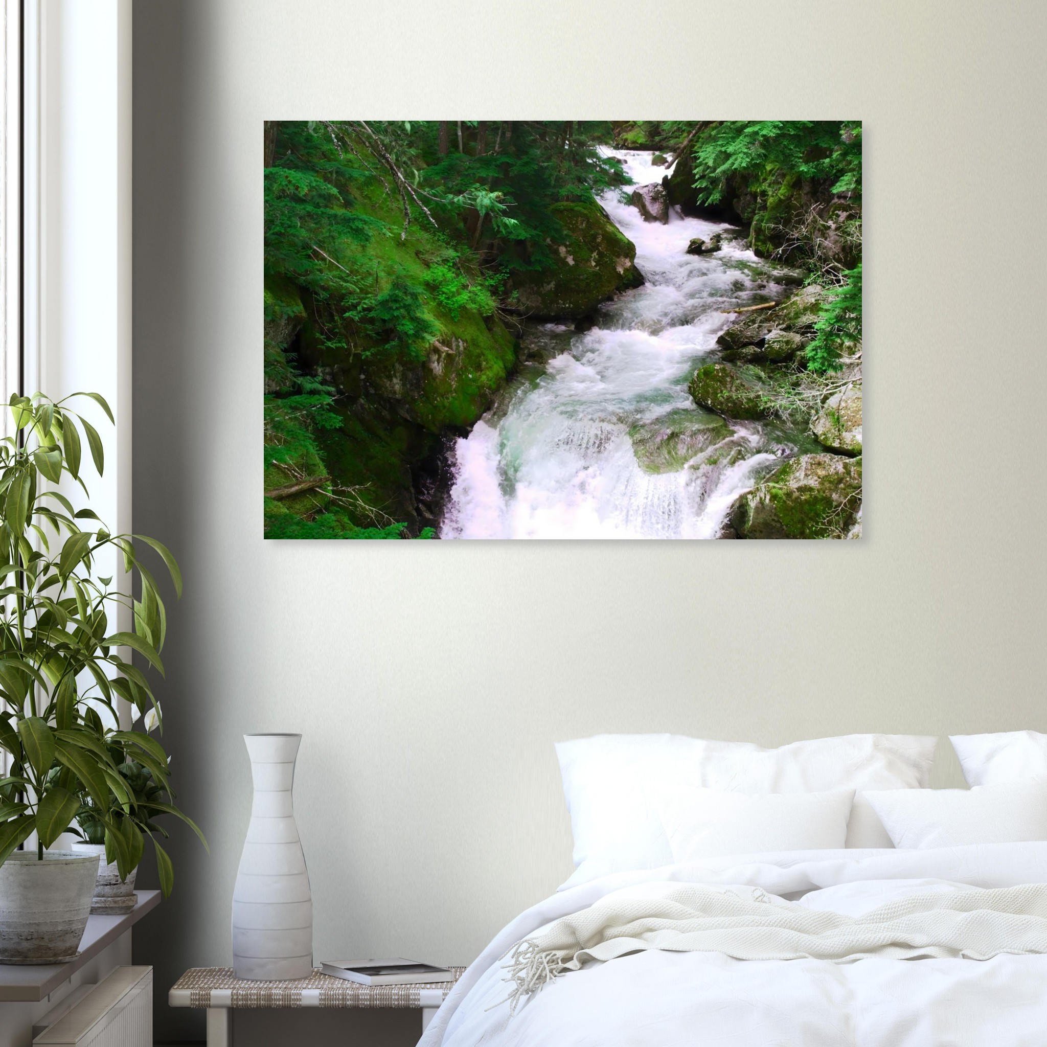 The forest tightens here. Water surges through moss-covered stone, carving its path beneath towering evergreens. Rainbow Falls captures motion wrapped in calm — the raw energy of the river softened by deep greens and filtered light. This piece brings a sense of life, flow, and quiet strength into modern, minimalist interiors.