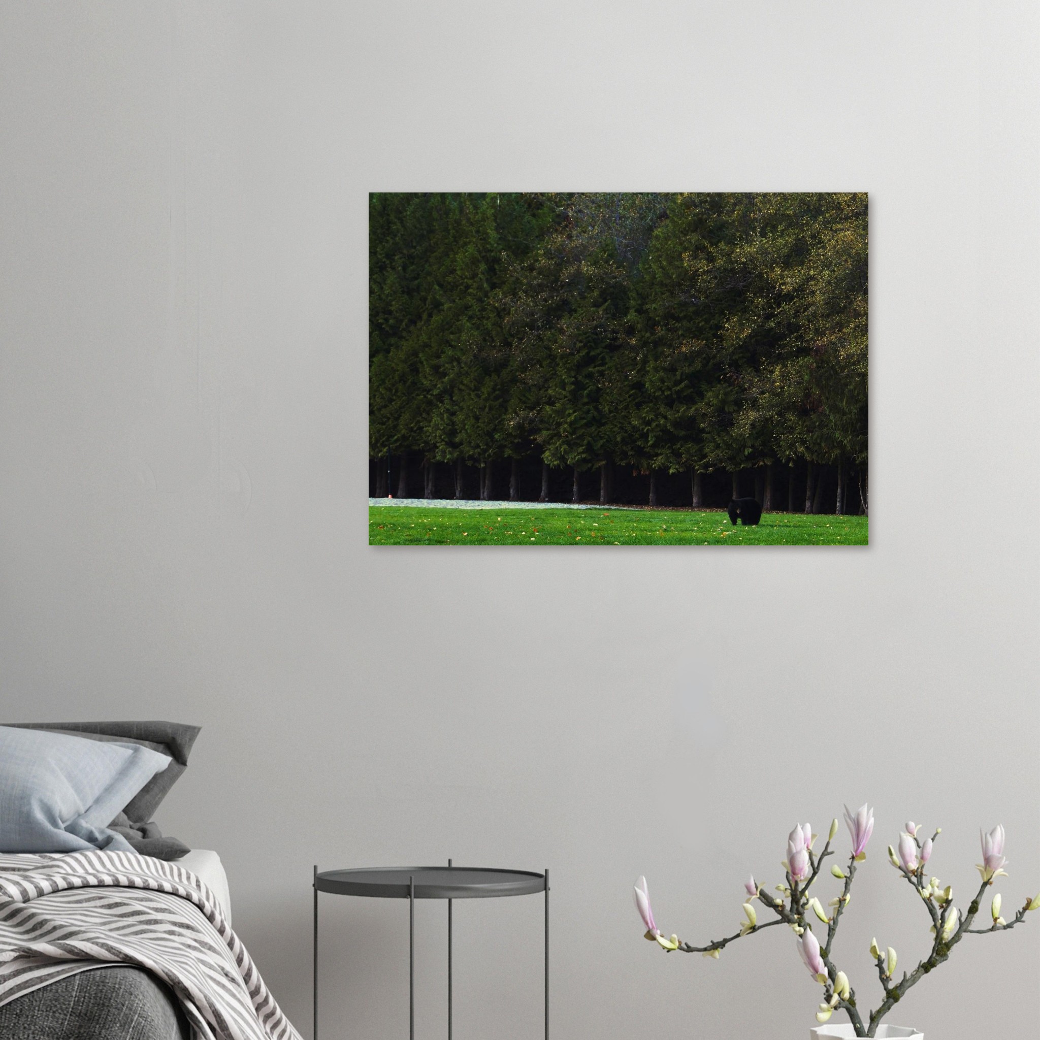 The forest watches here. A lone black bear steps from the treeline, moving slowly across an open field as autumn leaves scatter at its feet. The Park Bear captures that quiet meeting between wilderness and the everyday — a reminder of how nature appears when we least expect it. This piece brings a grounded, contemplative presence to modern, minimalist interiors.