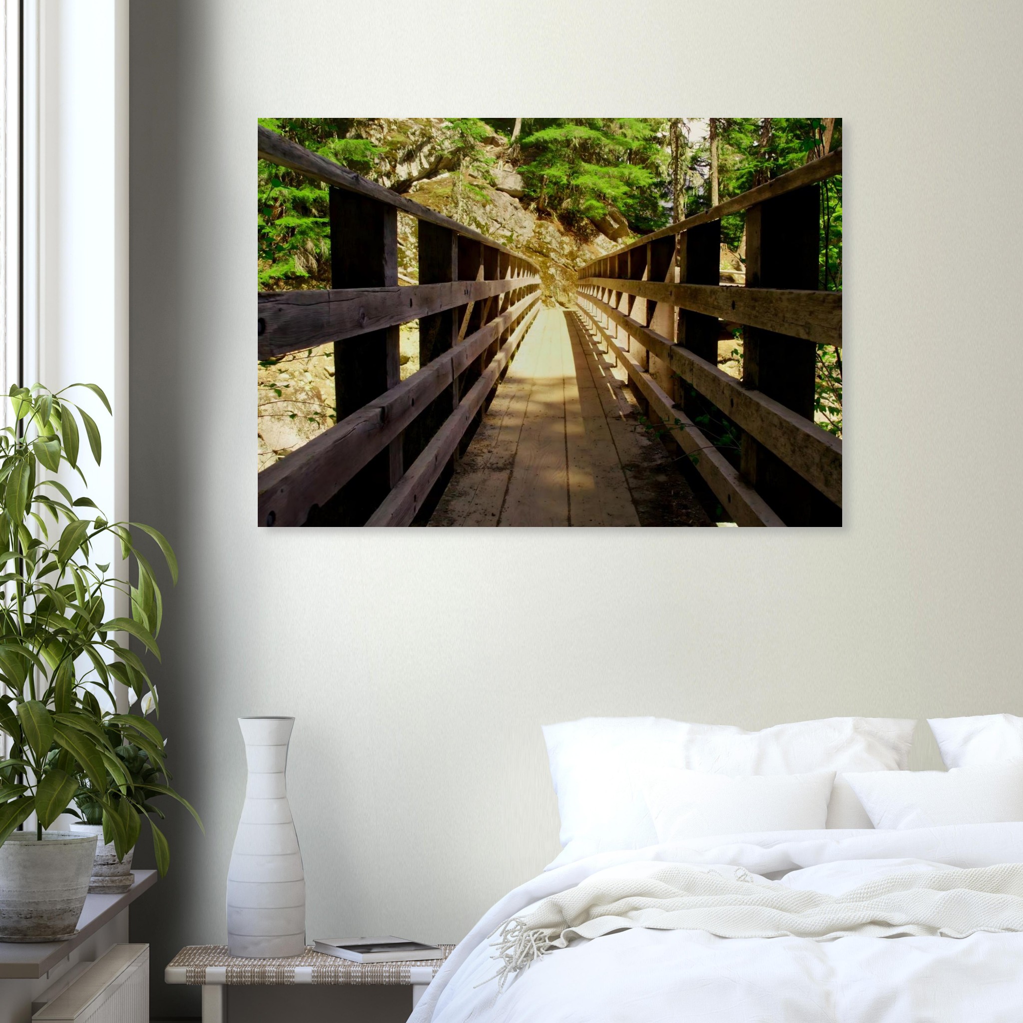 The path narrows here. Sunlight spills across worn timber as the bridge carries you forward, suspended between forest and stone. The Crossing captures a quiet moment of transition — the space between where you’ve been and where you’re going. This piece brings warmth, direction, and subtle depth to modern, minimalist interiors.
