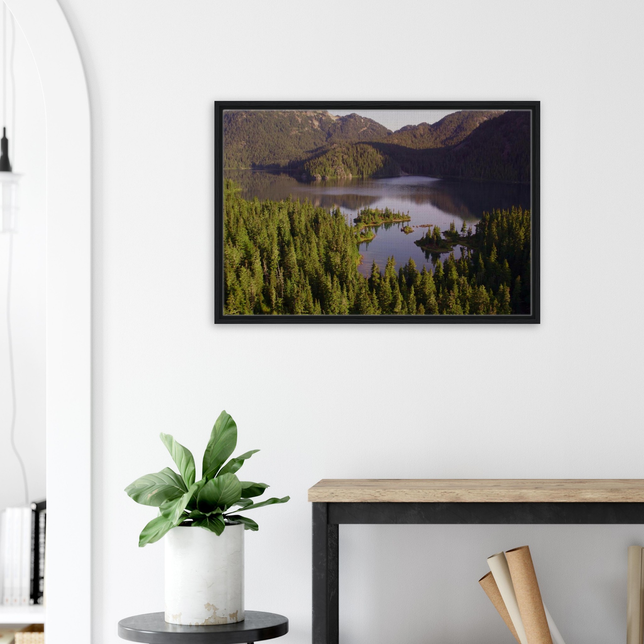 The land opens here. A quiet alpine lake curves through dense evergreen forest, reflecting surrounding peaks in softened light. The Stillness of Lake Callaghan captures the calm that settles when water, land, and sky fall into balance. This piece brings space, clarity, and grounding to modern, minimalist interiors.