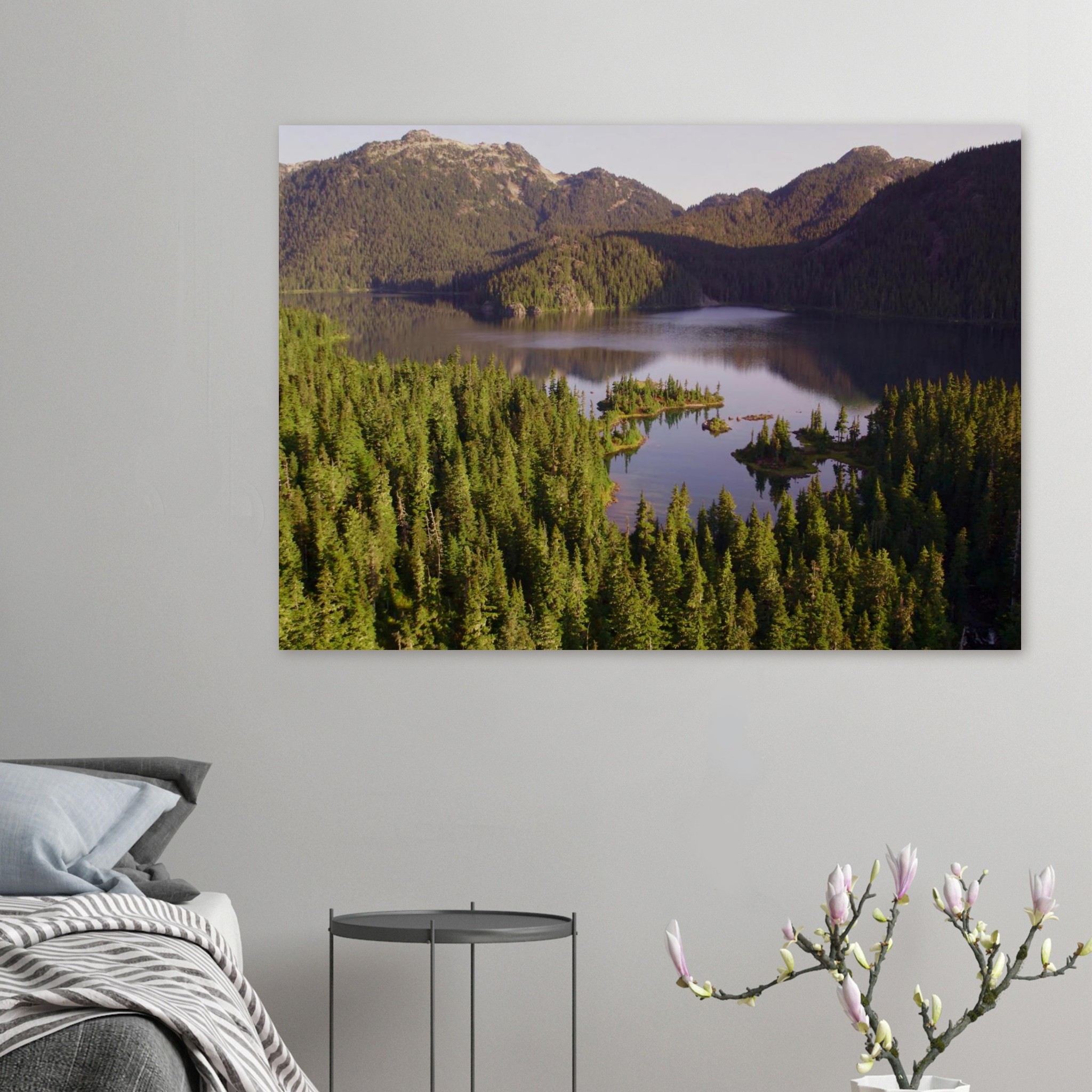 The land opens here. A quiet alpine lake curves through dense evergreen forest, reflecting surrounding peaks in softened light. The Stillness of Lake Callaghan captures the calm that settles when water, land, and sky fall into balance. This piece brings space, clarity, and grounding to modern, minimalist interiors.
